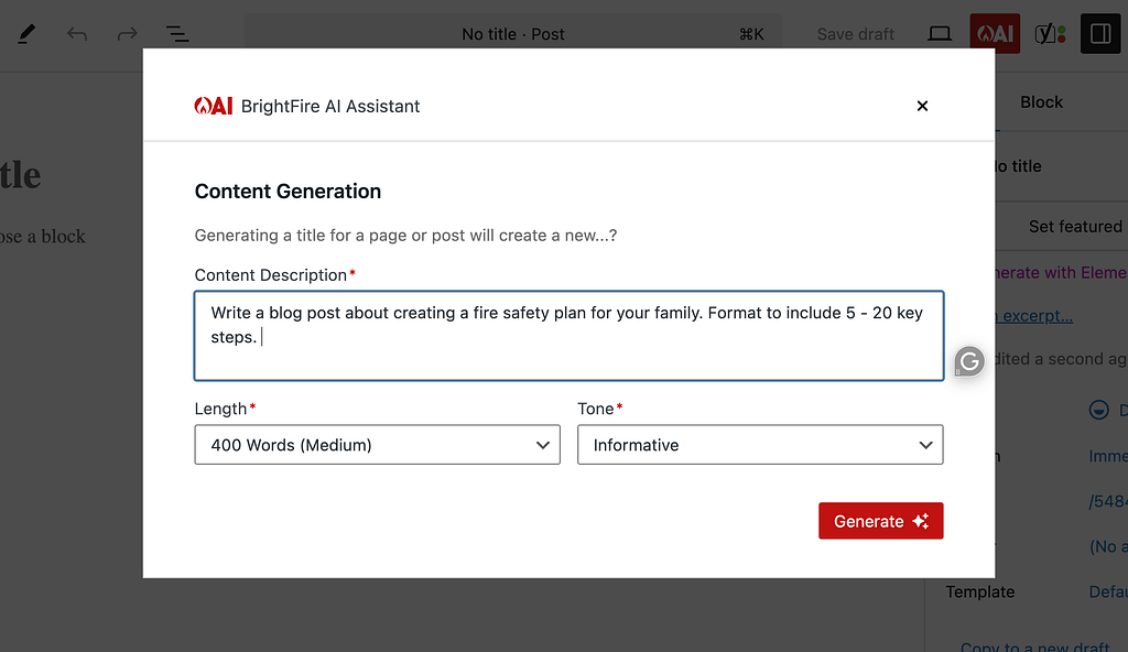 Built into BrightFire’s Insurance Agency Websites, users can quickly generate images, titles, and long-form written content. Specifically tailored for insurance agencies, this new tool empowers users to create content that is SEO-friendly and meets your agency’s needs.
